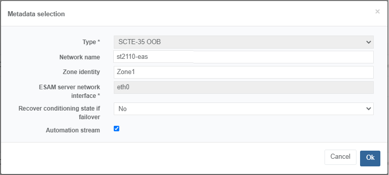 Parameter Value Description Type SCTE-35 OOB Select the type of metadata. Network name st2110-eas Corresponds to the Acquisition Point Identity defined in the ESAM specification. Zone identity Zone1 Corresponds to the Zone Identity defined in the ESAM specification. Recover conditioning state if failover Leave to No Selecting POIS enables to keep the conditioning status after an encoder failover by asking to an external system. It requires entering the POIS URL and network interface name. Automation stream Tick this checkbox. Activates Live Encoder out-of band interface to communicate with Prisma. You should have the following configuration for the out-of-band stream: