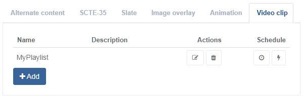 Click Add then enter the Material ID (name of the TS file), the Duration and optionally the Start offset.
