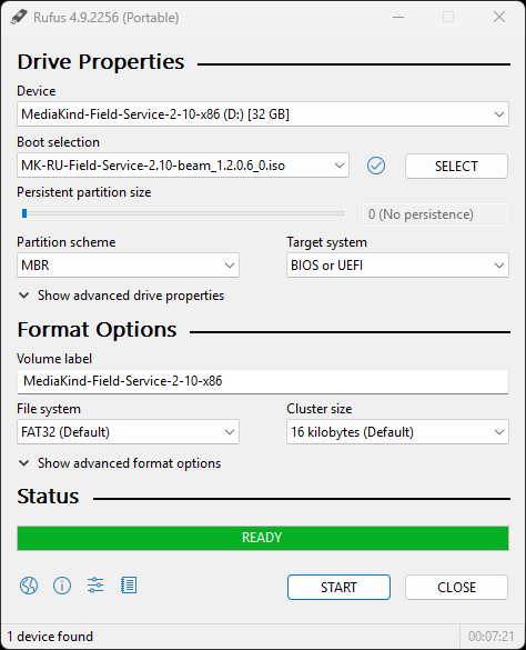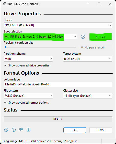 - When the ISO file has been written to the USB drive, Rufus will change the status to READY: