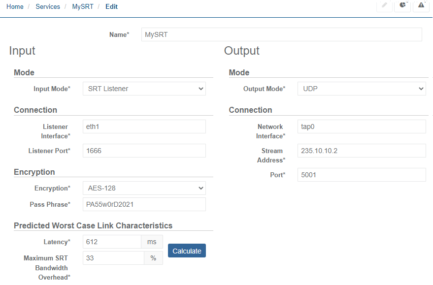 Configure the SRT Listener Connection parameters with the listener address and port. If required, then Encryption. Link characteristics parameters can also be set or adjusted.