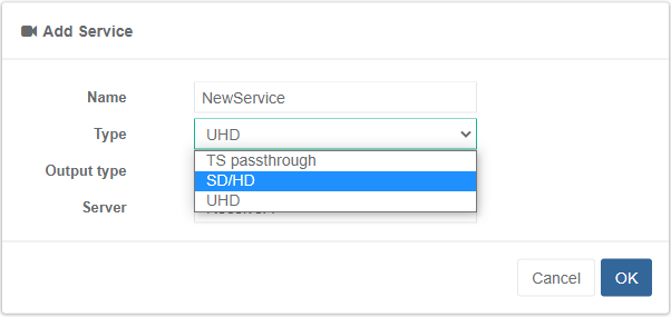 Set service Type to SD/HD. The new service is now created and must be edited before starting.