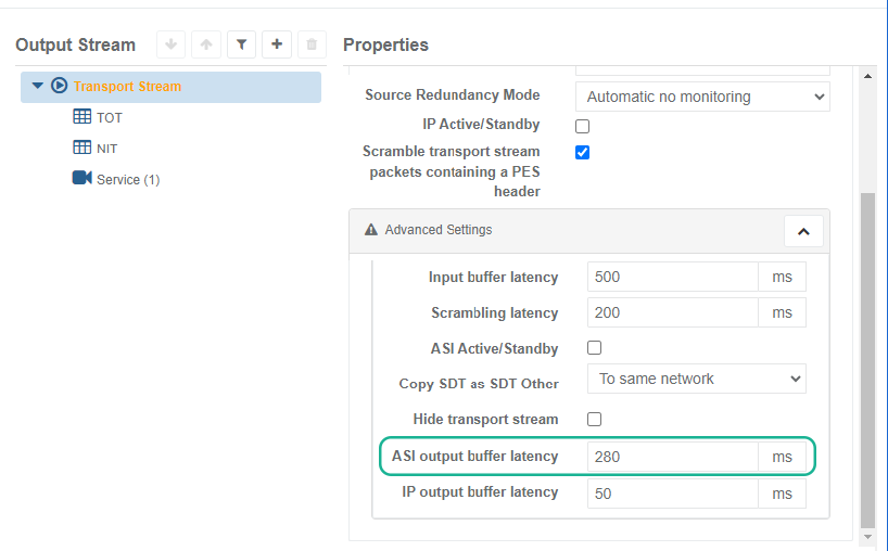 Go to the Mux tab then unfold the Advanced Settings submenu. You can set the ASI output buffer latency.