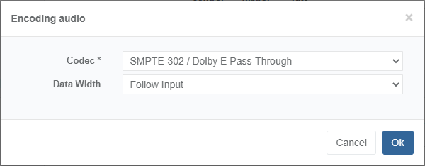 LPCM and Dolby-E inputs on SDI can be passthrough and carried on the TS as SMPTE-302 and Dolby-E respectively by selecting the SMPTE-302 / Dolby E Pass-Through codec from Live Encoder Encoding > Audio encoding section (see Configure the audio encoding parameters).