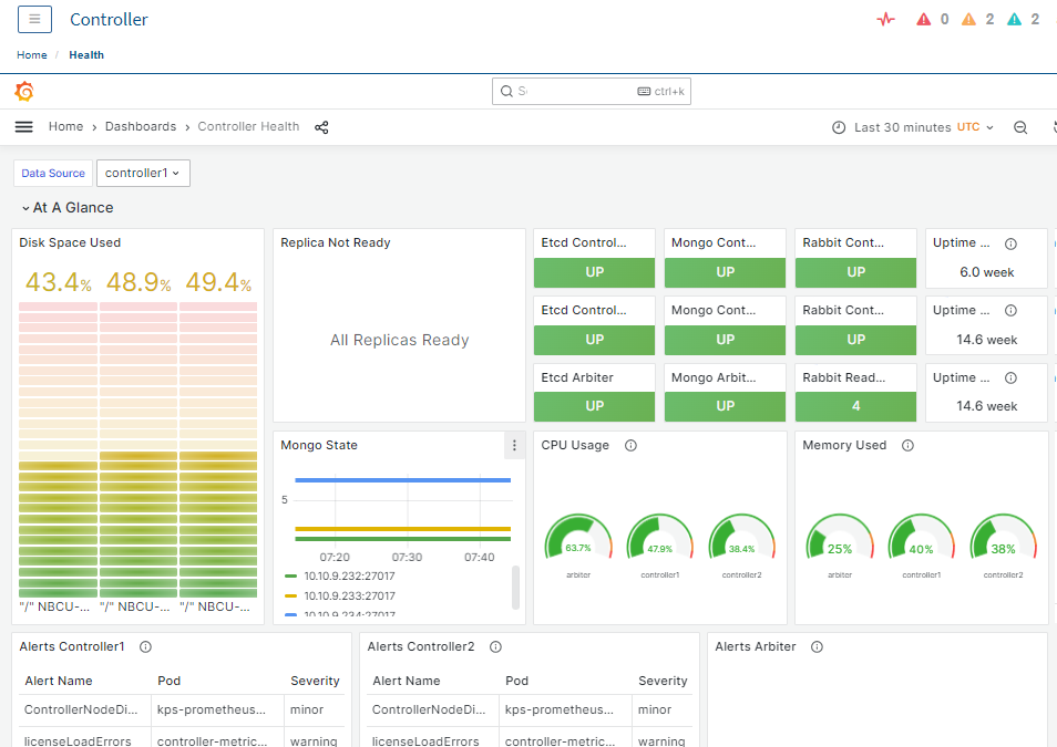 The Controller utilizes Prometheus and Grafana to enhance monitoring capabilities. The Health page presents a dashboard with various indicators to effectively monitor your solution. This page will look different depending on the deployment type.