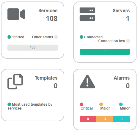 The Home page displays a dashboard with overviews for services, servers, templates and alarms. Click an overview to link to the related page.