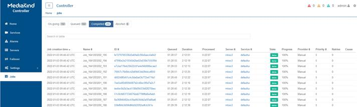 The jobs menu allows you to access a jobs overview. You can monitor on going, queued, aborted, completed or uncompleted jobs all from the same jobs overview page. This menu only displays if On-Demand Encoder component is used.