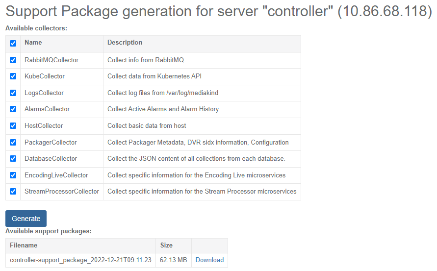 Click Generate to generate a new support package.