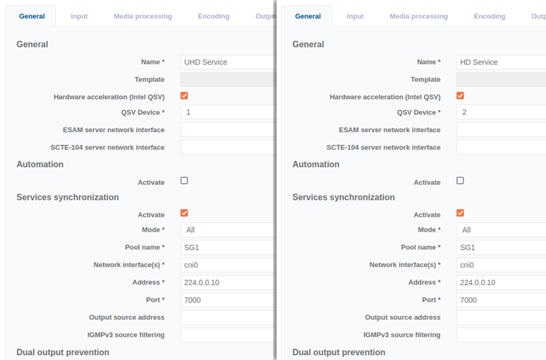 On the first encoder, click the General tab then go to the Dual output prevention section and tick the Activate checkbox. Parameters related to the dual output prevention are displayed.