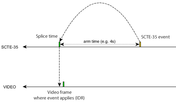 | PTS insertion compensation | Only available with Conditioning. Enable pts insertion compensation. If checked, the pts_adjustment of an SCTE-35 event will be adjusted so that the splice_time + pts_adjustment corresponds to the PTS of the video frame, as illustrated below: ![]() Note: Arm time is the time that separates the SCTE-35 event from its execution. |