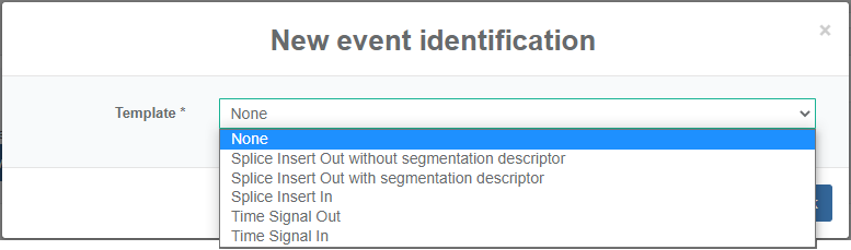 A pop window appears, providing option for pre-defined SCTE-35 event identification (template).