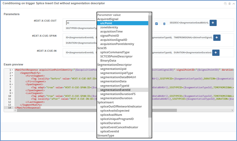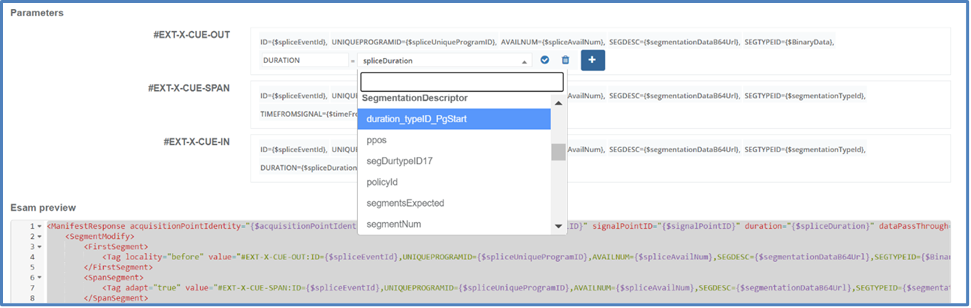 - Splice insert attributes: similar to HLS, user can define the attribute and the value from a drop-down list and see the result within the ESAM preview.