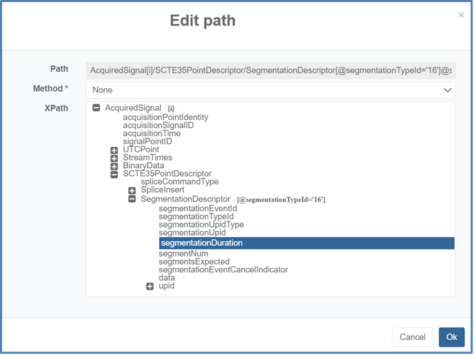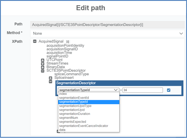 Under XPath, navigate in the SCTE-35 as follows: AcquiredSignal > SCTE35PointDescriptor > SegmentationDescriptor, and click on the [i] located at the same level as segmentationDescriptor