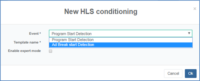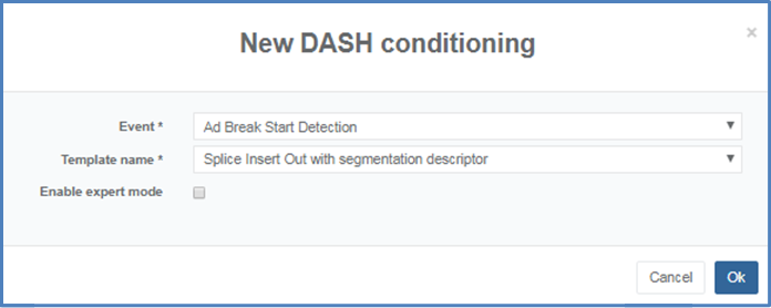 Configure the conditioning as shown below (use of Ad Break Start Detection event configured previously, with Splice Insert Out with segmentation descriptor template).