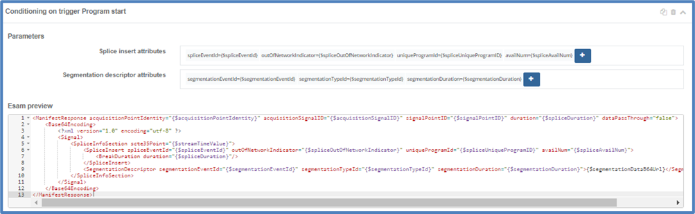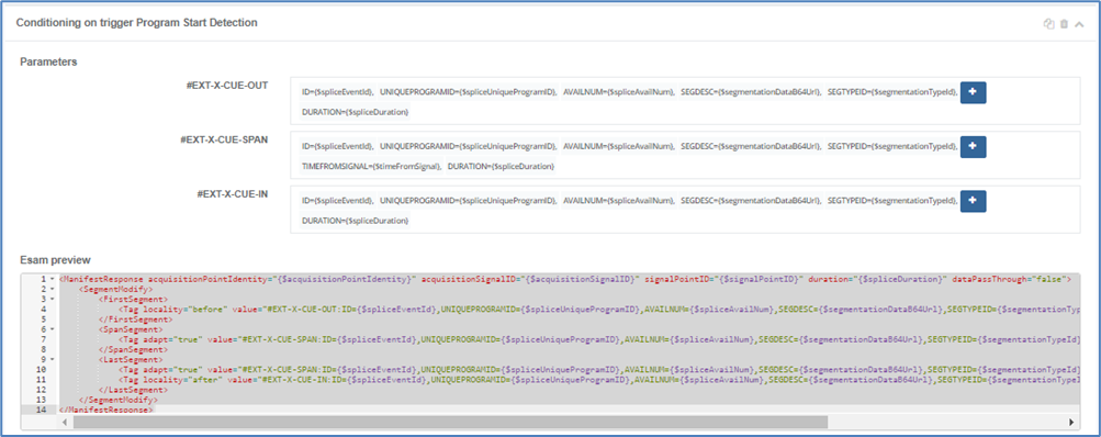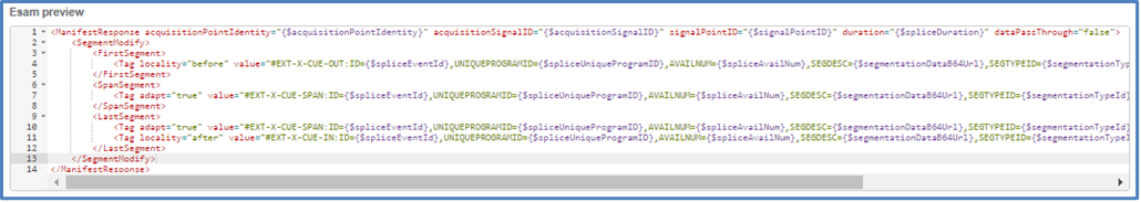 This ESAM preview cannot be modified, in particular the tags used which in this case are hardcoded with the following values: #EXT-X-CUE-OUT, #EXT-X-CUE-IN, #EXT-X-CUE-SPAN.
