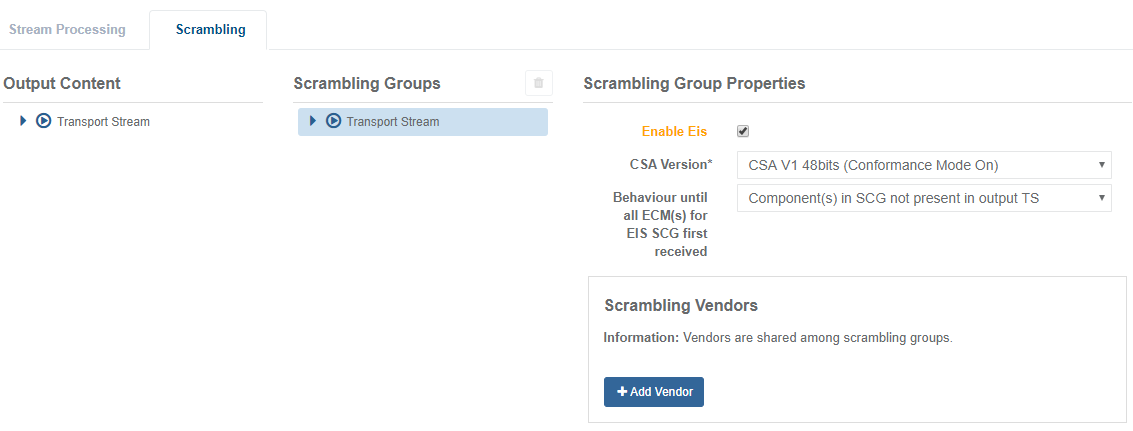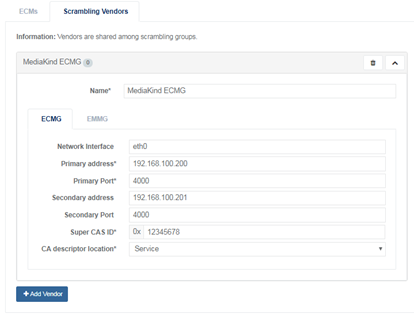 Configure an ECMG for the SCG by clicking Scrambling Vendors tab, then click + Add Vendor to configure.