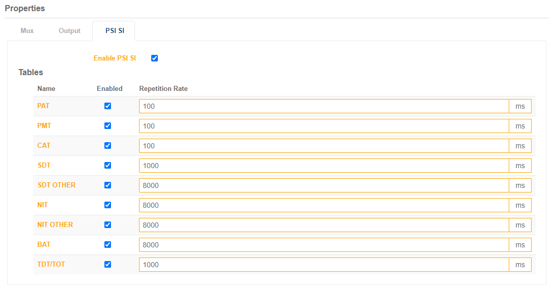 Open the PSI/SI tab and configure the PSI/SI generation and table repetition rates.