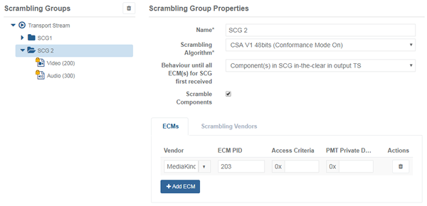 Add an ECM to SCG 1 by selecting the ECMs tab, then click + Add ECM to add and configure. (The Vendor is based on the ECMG definition). The ECM is now configured.