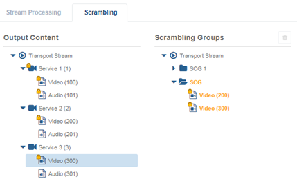 Drag and drop the video component with PID 200 from Service 2 to the Transport Stream in the Scrambling Groups panel. A new SCG is created with PID 200 as the scrambled component.