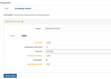 Add the EMMG vendor using the Scrambling Vendors tab in the EMM properties.