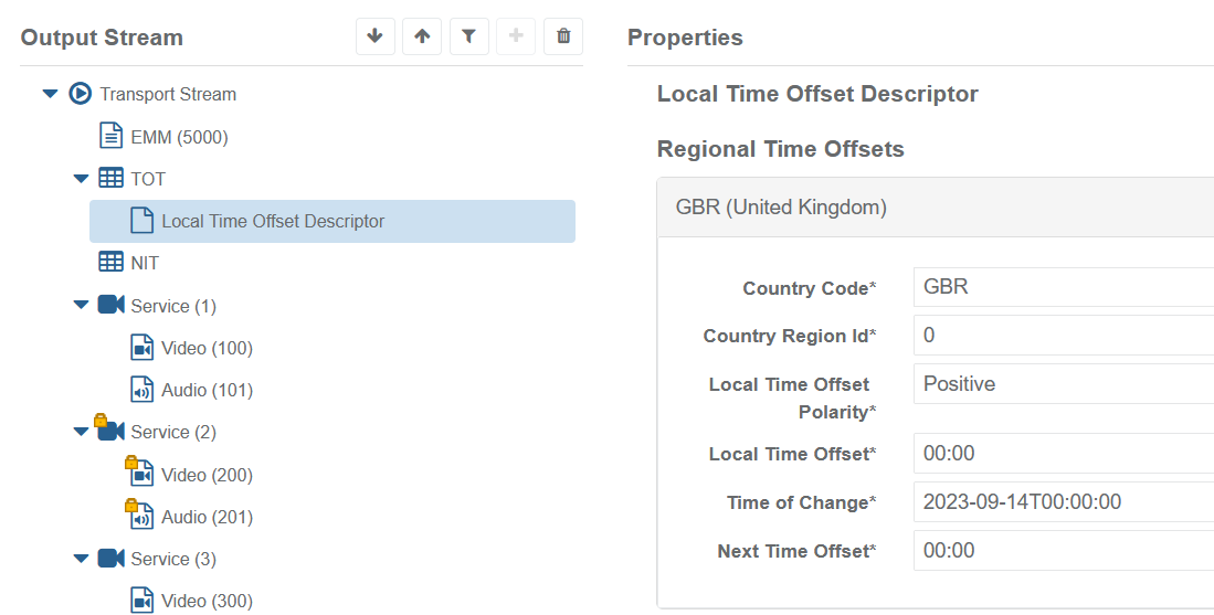 Select the Service item in the transport stream, or select the transport stream and add a service to the output transport stream. The properties display.