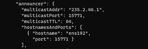 To check the announcer muticast information for the Mux microservice, type kubectl get configmap -n mediakind stream-processor-mux-config -o yaml and search for the announcer part of the sparkmuxIni.json: section. It should look like this, but with a different value for the multicastAddr field, depending on your deployment and installation options: