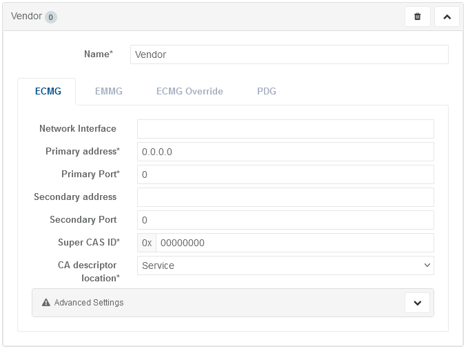 | Primary port* | Port number for the primary ECMG | 0 to 65535 |
