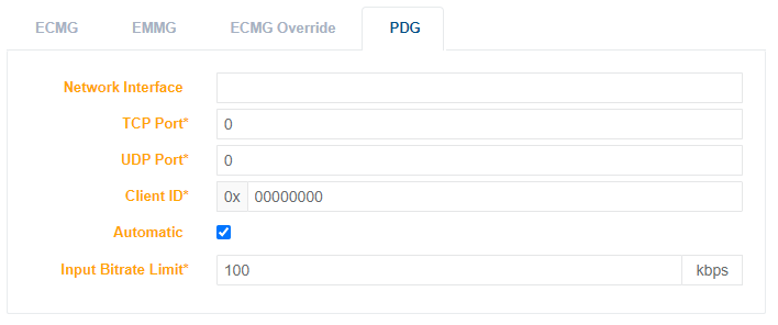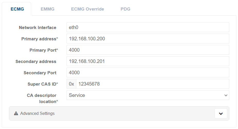 | Client ID* | As per ETSI 103197 DVB Simulcrypt. Hexadecimal format. | From 0 to 4294967295 |
