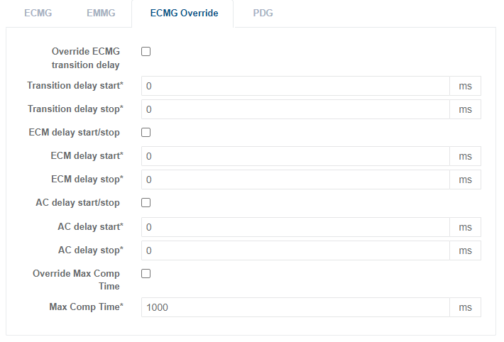 | Override ECMG transition delay | When this tick box is enabled, the subsequent parameters Transition delay start and Transition delay stop are used to override the transition delay information in the ECMG | Tick box, disabled by default |