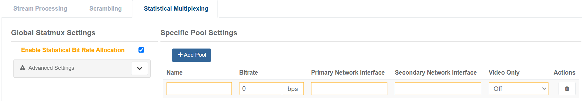 | Video Only | Specify if only Video components are to be included in the statmux pool. | Dropdown menu: Off, On |