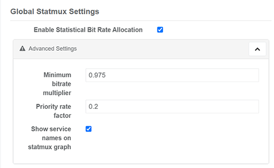 | Show service names on statmux graph | Causes the statmux statistics page to display the encoding live service name instead of the Channel Id. | Tickbox, enabled by default |