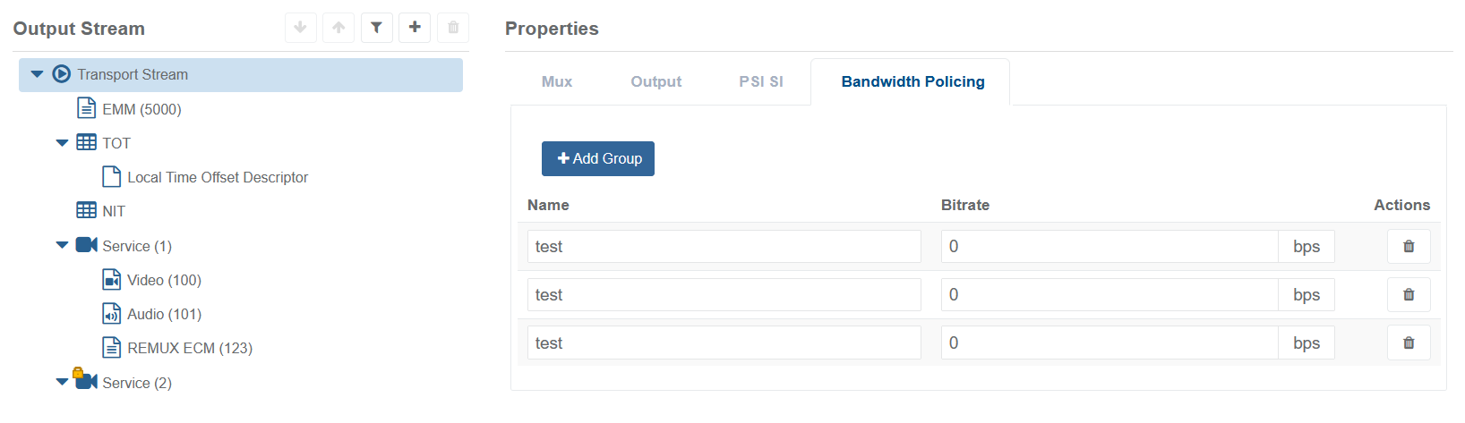 | Bandwidth Policing Group | If any Bandwidth Policing Group has been defined for the transport stream (see previous paragraph), the list of all group names will appear as a dropdown menu. Assign the service to one of the groups or leave the selection empty to avoid policing it. | Dropdown menu: names of any defined bandwidth policing group. |