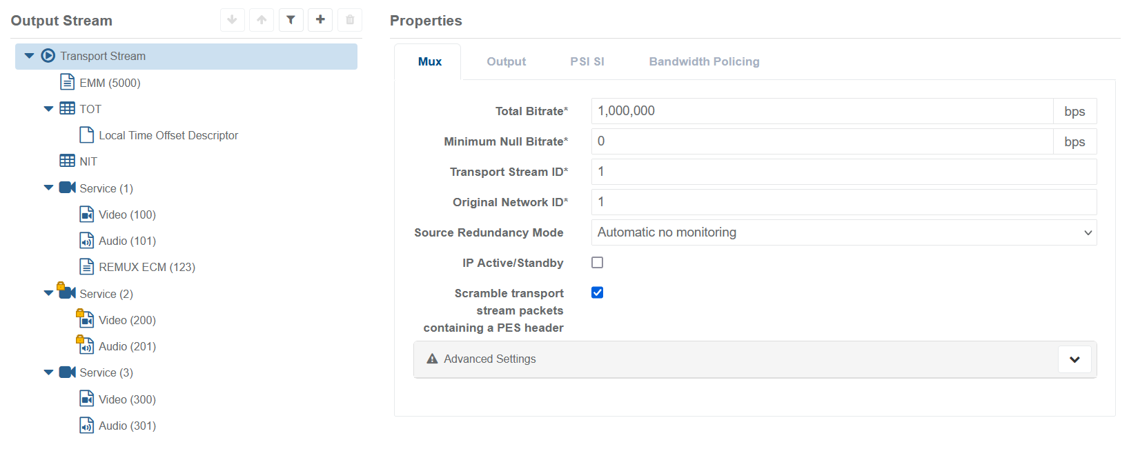 | Scramble transport stream packets containing a PES header | TS packets containing a PES header are scrambled if scrambling is required for the current service. | Tick box, enabled by default |