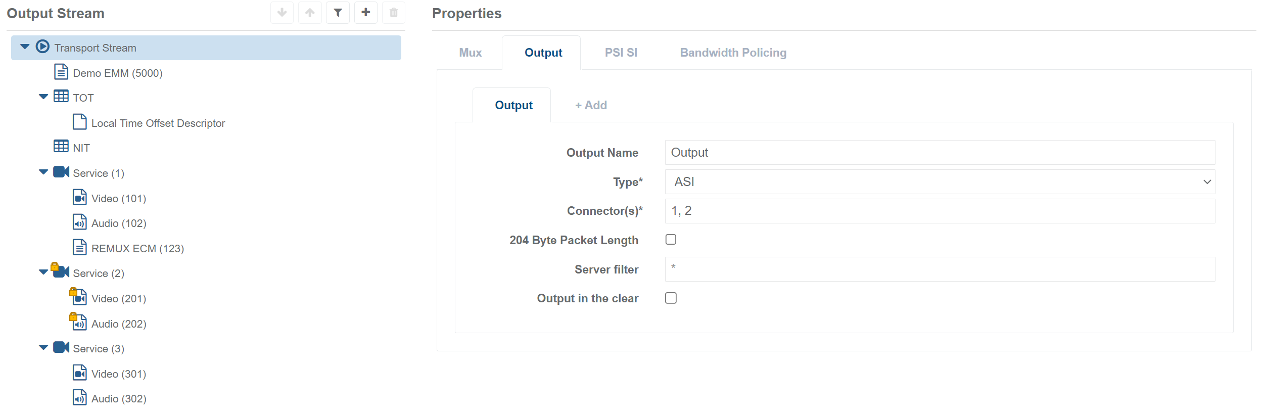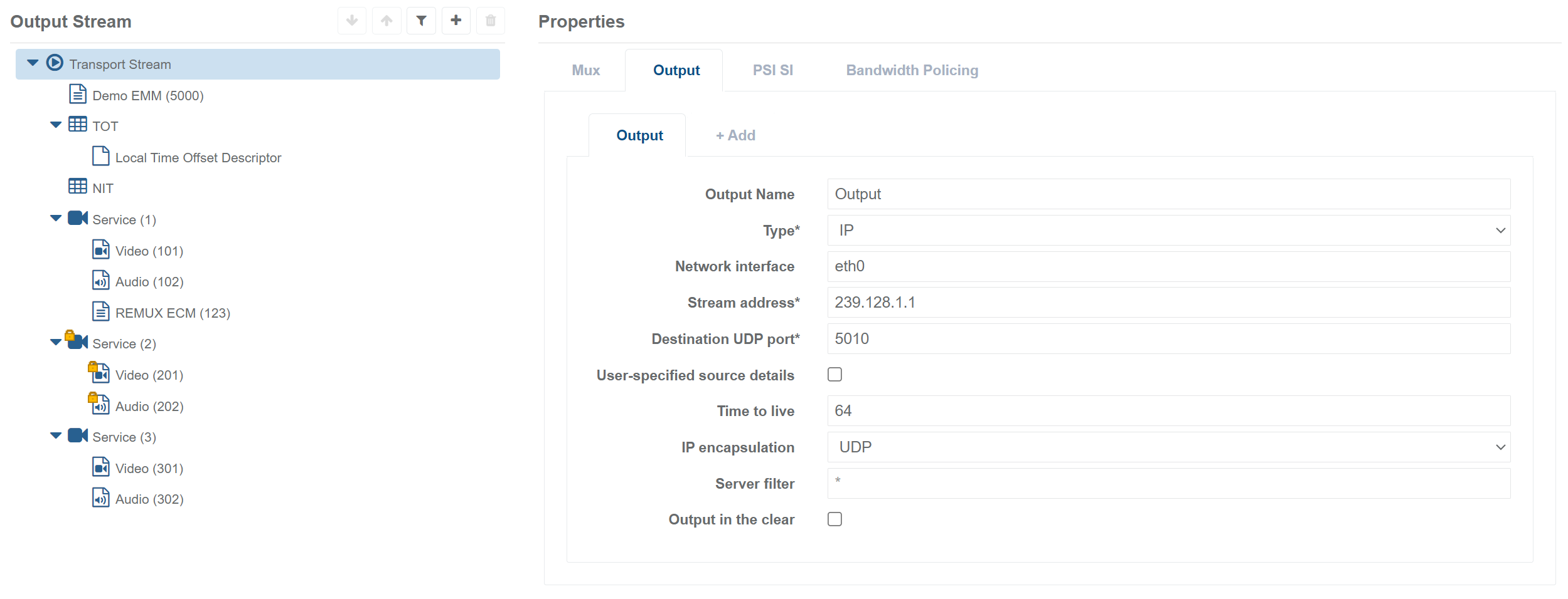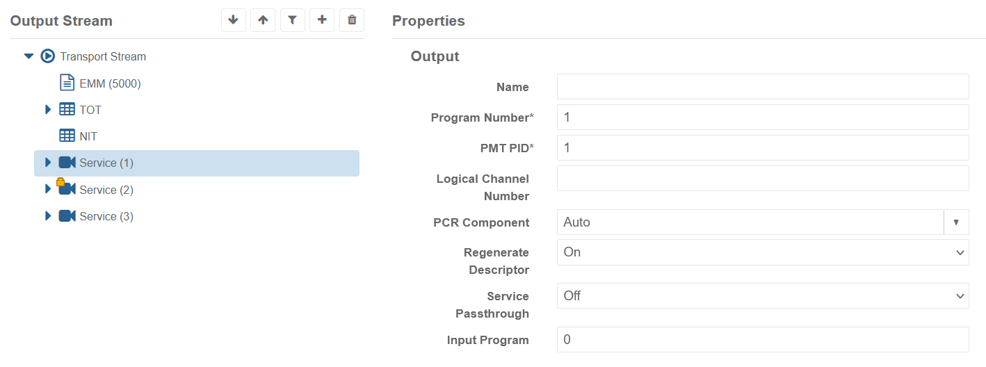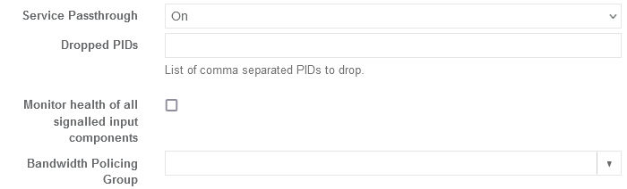 | Service Passthrough | Automatically add components and descriptors from the specified input service to this output service. If the specified input service cannot be found, there will not be an output PMT or PAT reference. This behaviour is dynamic and the output PAT/PMT references will track changes to the incoming service. | Dropdown menu: Off, On |