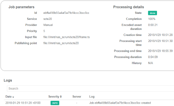 If the service is currently running, then the Job launches automatically. The .ts and/or .mp4 files are generated in the defined output folder. Jobs set with the same priority are launched in order, per job creation date.
