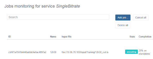 A single Encoding On-Demand service may have multiple jobs. The Jobs menu offers a centralized view of on-going, queued, completed, and aborted jobs (manually stopped or in error).