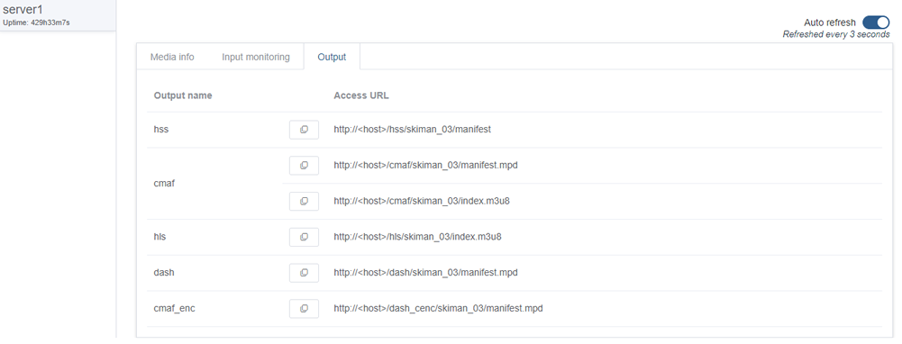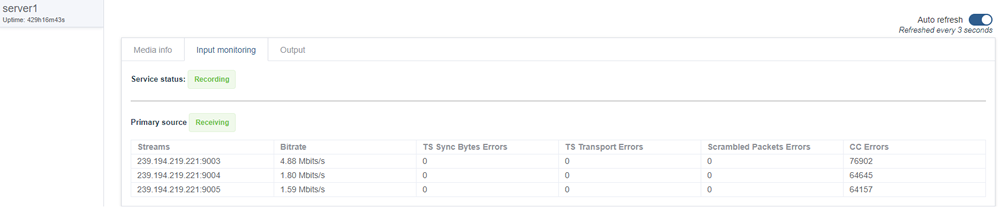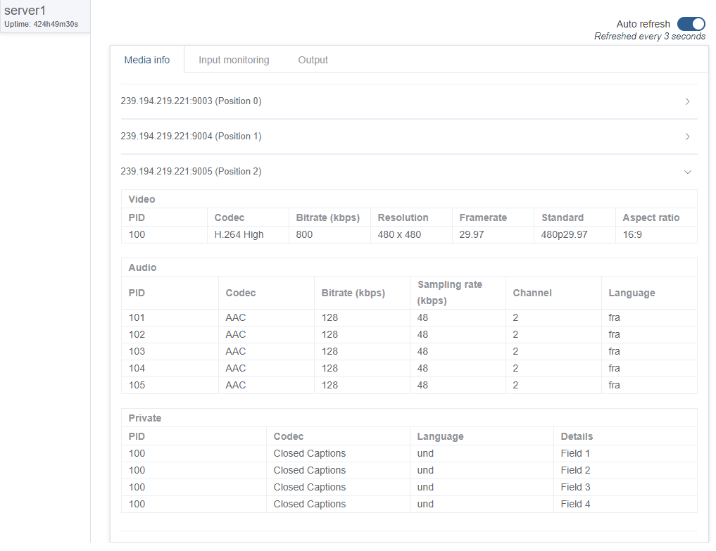 You can navigate between three tabs: Media info, Input monitoring and Outputs.