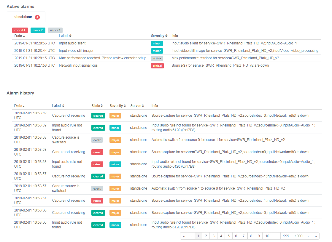 The alarm history table displays up to 10 alarms per page. Use the arrows or page number at the bottom of the table to navigate through the complete alarms list.