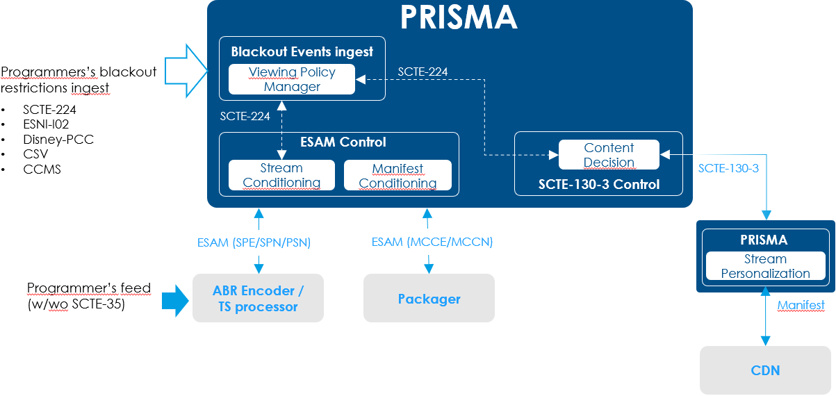 - Viewing Policy Manager: This service is aimed at providing ingest of program event data (ESNI-I02, SCTE-224, .CSV file etc.) and normalize them using SCTE-224 data model. Other Prisma modules like Stream Conditioning can then fetch the list of (SCTE-224) events and map corresponding control at the audio/video headend level (encoder control using ESAM for instance).