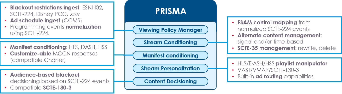 Applications targeted by Prisma are not limited to blackout and alternate content management. Prisma acts as a POIS (Placement Opportunity Information Service), leveraging ingested rules to manage SCTE-35 (rewrite, delete) and manifest conditioning for either DAI (Dynamic ad insertion) or alternate content switching.