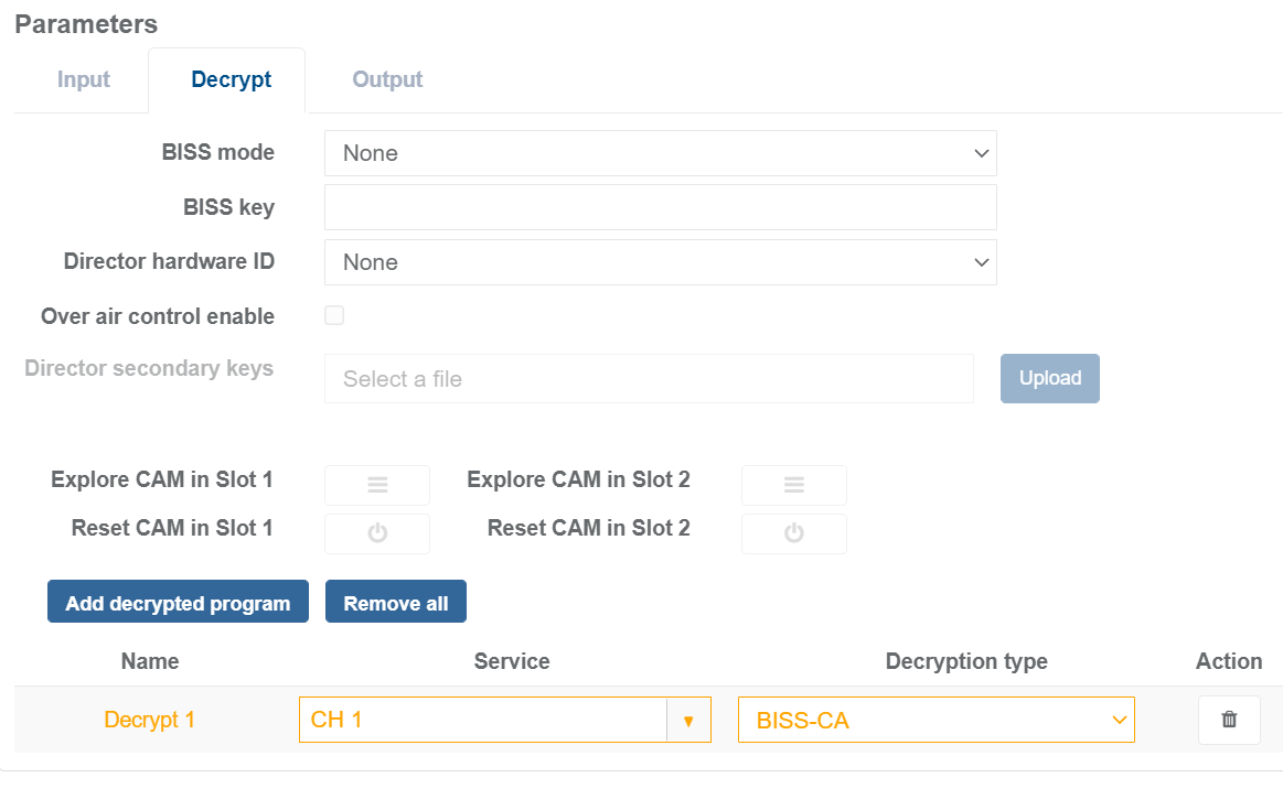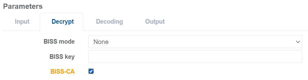 Tick the BISS-CA checkbox to enable decryption (untick the checkbox to disable decryption).