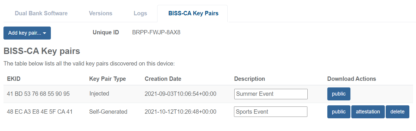 - Attestation: Download attestation data for the key pair; Self-Generated key pairs only.