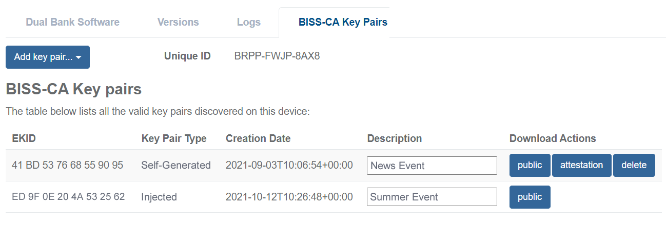 - Delete: Remove the key pair from storage on the unit; Self-Generated and Injected key pairs only.
