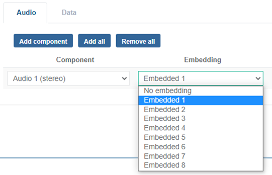 Go to the Audio tab then select Add all. All the decoded audio components that are not currently included in the output audio configuration are added to the component column (up to a maximum number of embedded channels available for the output video format in use). Embedded channels are allocated in sequence until all available channels are filled.