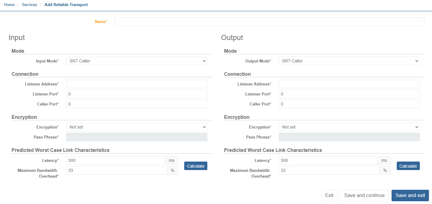 Select the Input Mode from the corresponding drop-down menu on the left side of the Reliable Transport service configuration page.