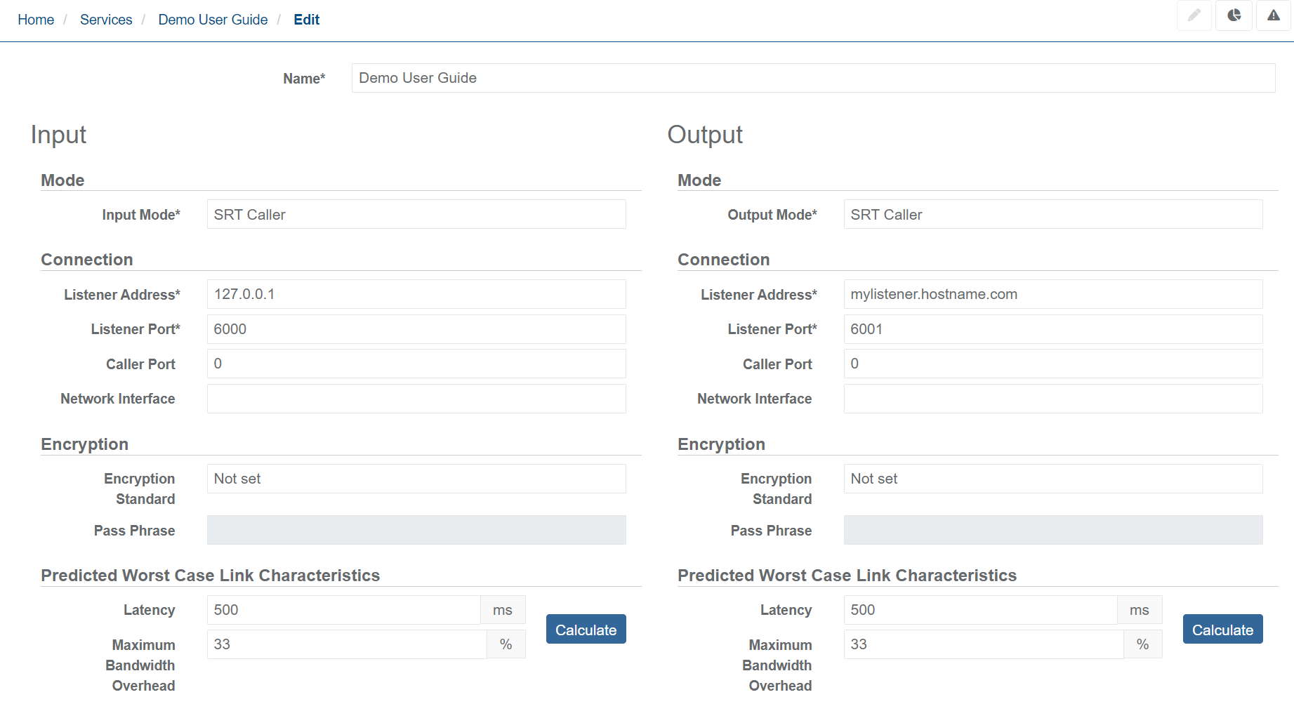 Set Round Trip Time and Packet Loss Rate according to the instructions and make sure the calculated values for SRT latency and Maximum Bandwidth Overhead do not show errors.