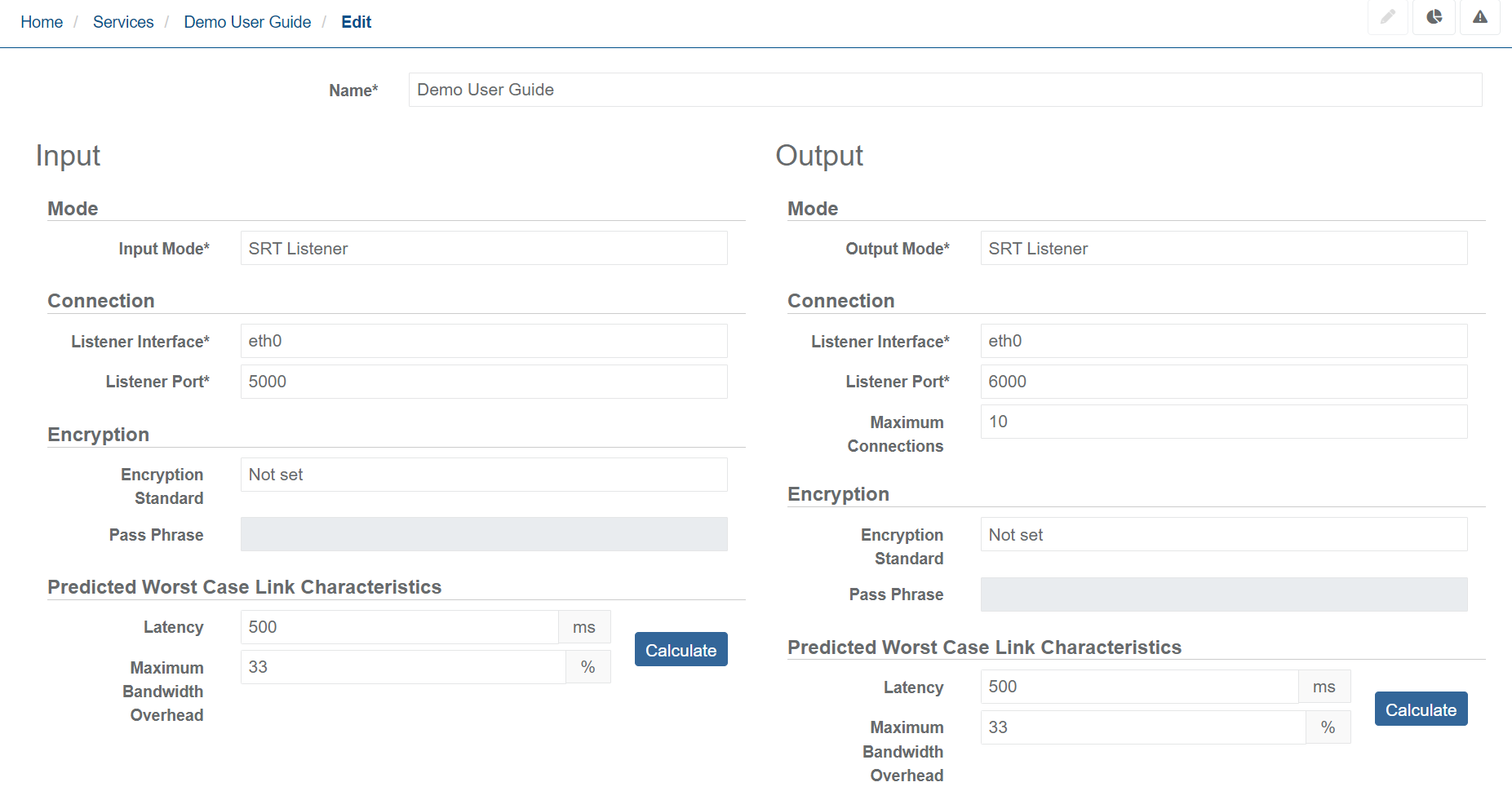 | Maximum connections | Maximum allowed number of SRT Callers that can connect to the output SRT Listener. Will impact number of licenses required. | Integer number between 1 and 65535 |
