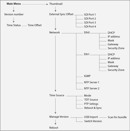 NTP must be configured from the unit front panel or using the “frontpanel” command line tool. Refer to the front panel menu diagram above.