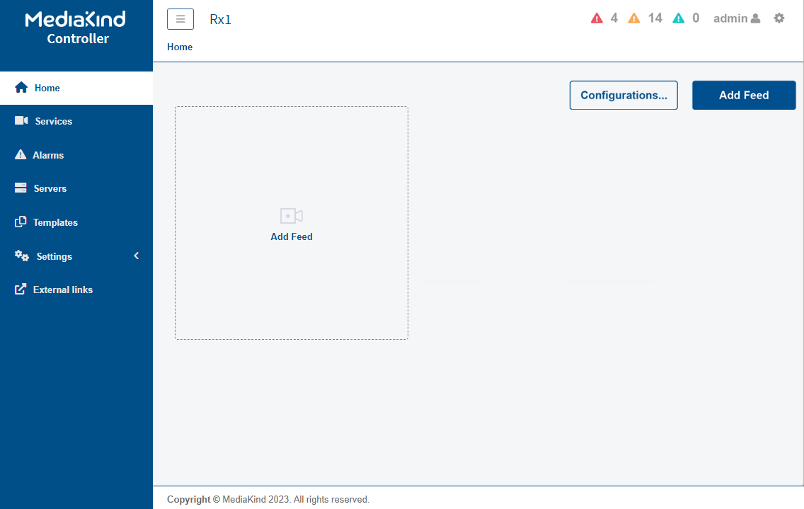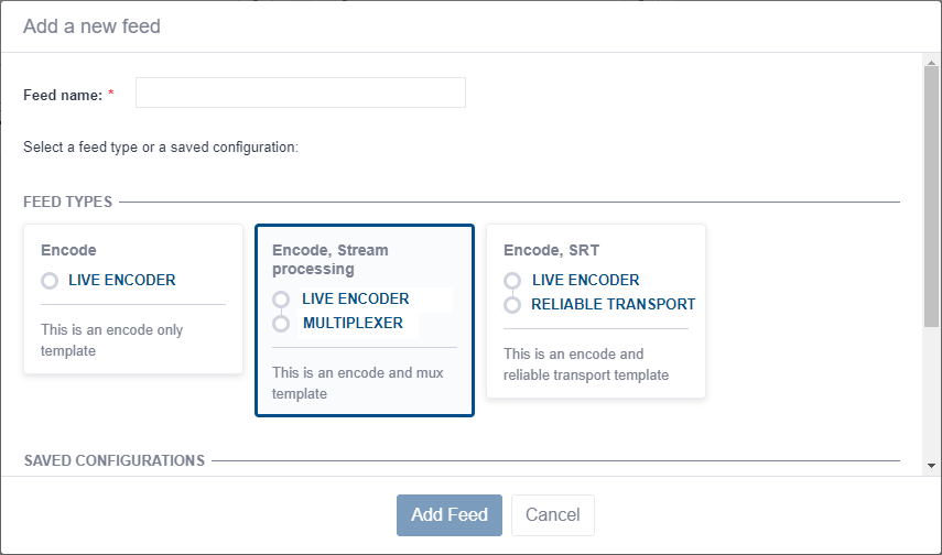 Enter a name for that feed then click the Add feed button. A new feed is displayed on the Home page. This feed has some basic predefined settings for Encode and Stream process components, but you will need to complete and configure some parameters.
