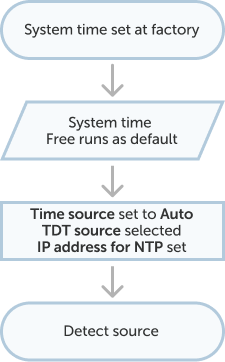When the unit is set to Auto, the unit will first attempt to lock to an incoming TDT component. If a valid TDT component in the selected service cannot be found, and an NTP component has been configured, the unit will then attempt to align to NTP. If both TDT and NTP are not present or invalid, then the unit system clock will free run.