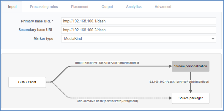As explained earlier, this base URL is completed with information from the initial viewer request to build the complete path to the live or VOD manifest.Secondary base URL Secondary source manifest endpoint from where PRISMA Stream Personalization can fetch DASH MPD manifest in case Primary is down. Marker type Select the format used to convey ad break information.-Select MediaKind (default marker type) or select a POIS plugin in the drop-down list for specific markers (see Manage Stream Personalization plugins).